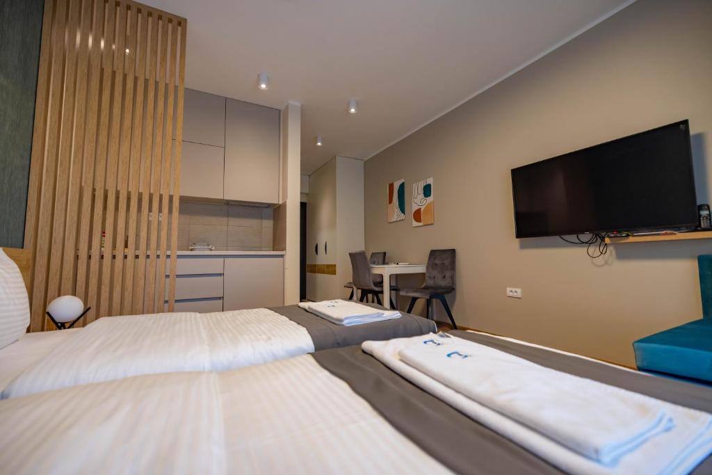 Omega Apartments nudi sobe kao što je Deluks Studio sa Bračnim Krevetom (King-size), Porodični Studio, Deluks Studio i Standardni Apartman.
